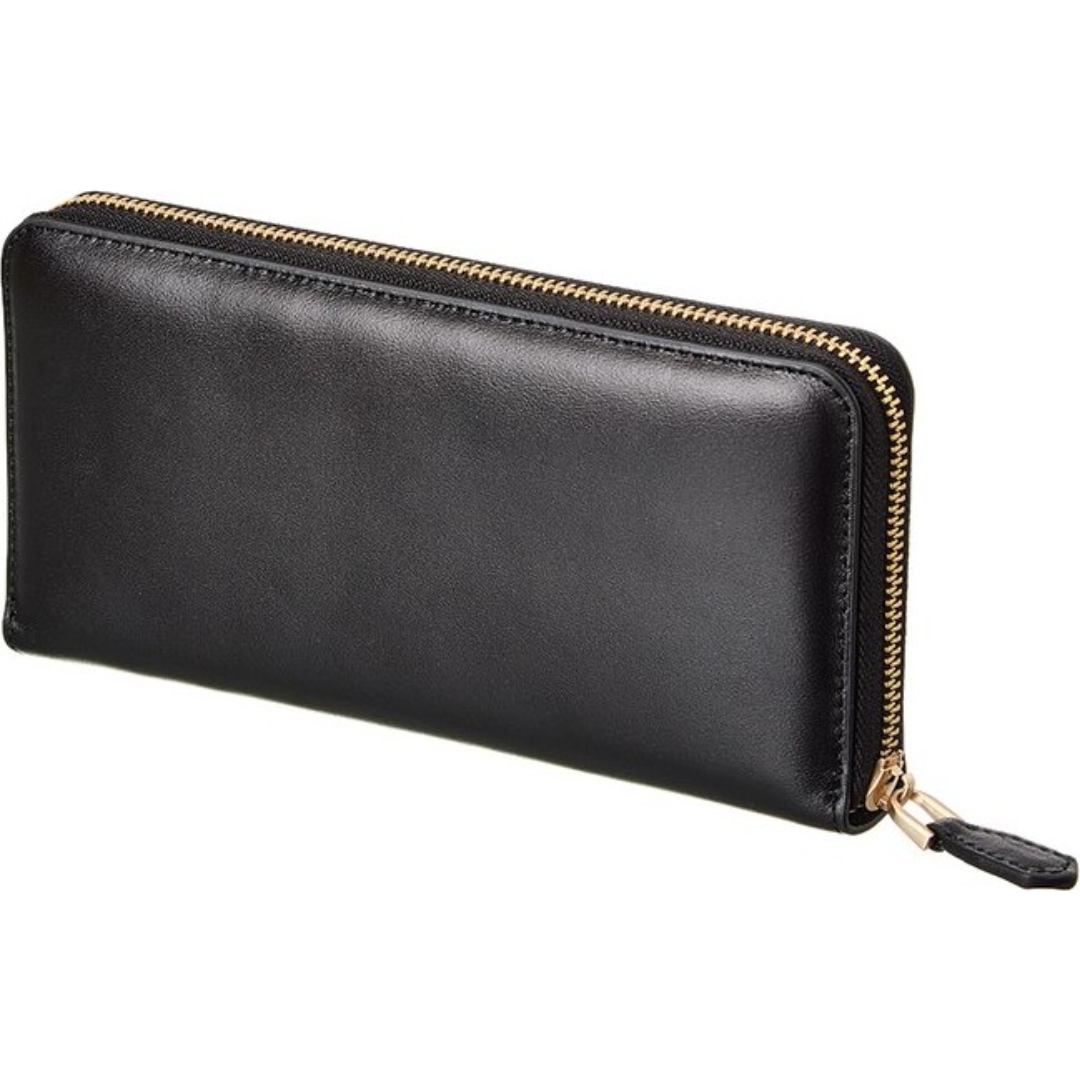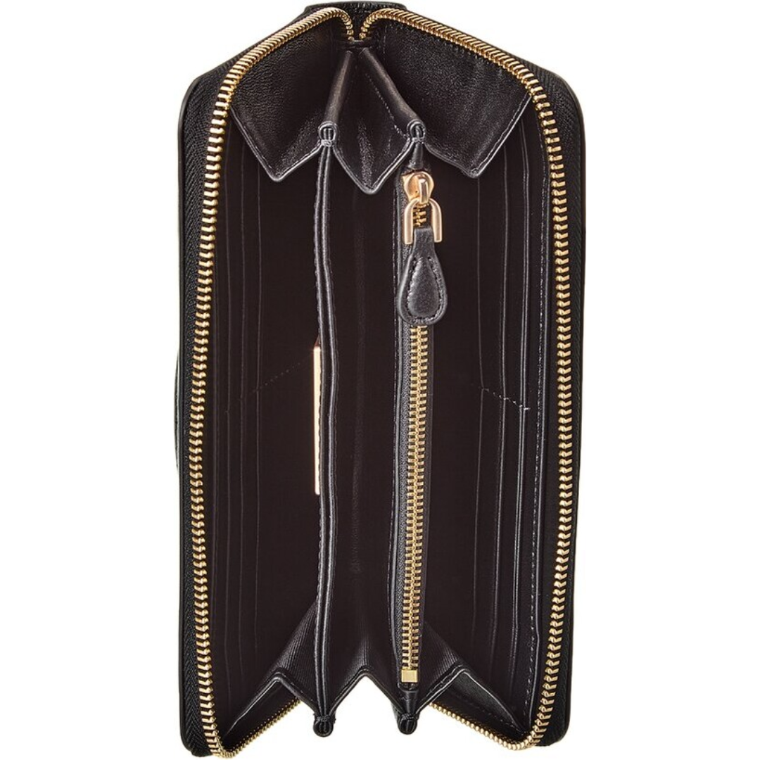 Elegante billetera de lujo confeccionada en Italia con cuero negro y herrajes en tono dorado y el logotipo V característico en el frente.